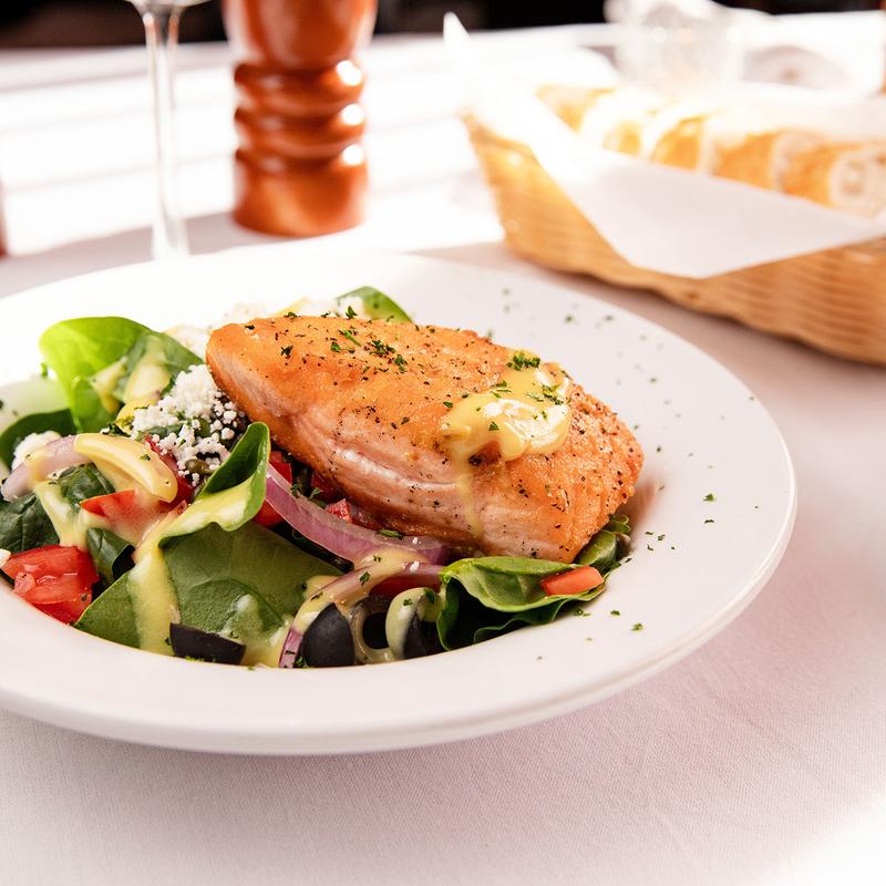 Baked salmon filet over fresh spinach with feta, black olives, capers, tomatoes, red onions & citrus vinaigrette